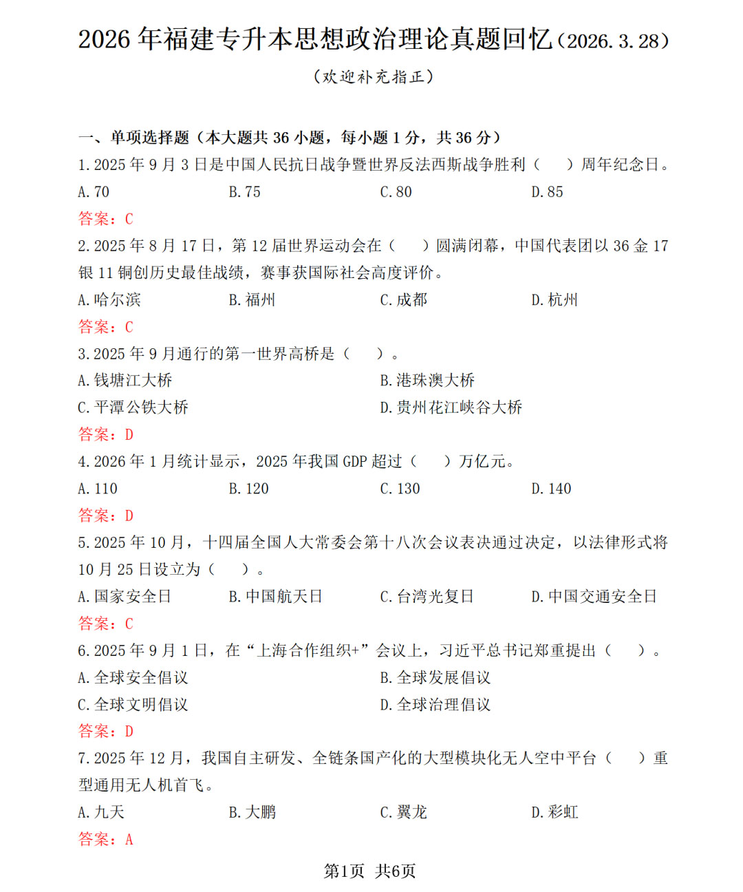 2026年福建专升本考试已于3月29日顺利结束,福建专升本平台在此祝大家顺利上岸!小编根据考生对考试真题的回忆,整理了2026年福建专升本真题考生回忆版,供大家参考。